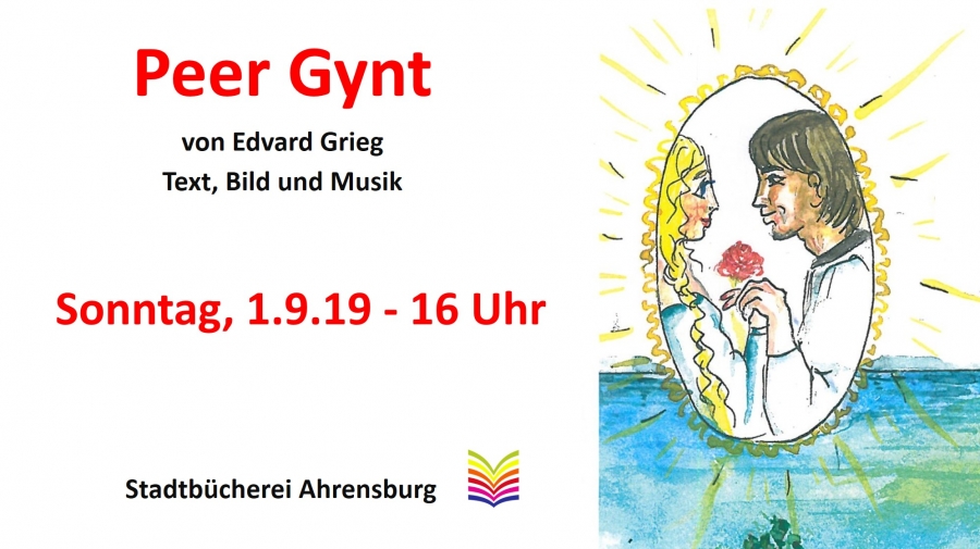 Am Sonntag, dem 1. September 2019 um 16.00 Uhr lädt die Bücherei Ahrensburg sein junges Publikum zu dem Kinderkonzert „Peer Gynt“ von Edvard Grieg ein. Peer Gynt wird zu einer märchenhaften Reise aufbrechen. Er ist ein junger ungehobelter Bauernsohn aus Norwegen, der seiner Umwelt, um sie zu beeindrucken, immer wilde Lügengeschichten erzählt. Solveig ist ein junges Mädchen, das Peer Gynt trotz seiner Eigenart sehr lieb hat.